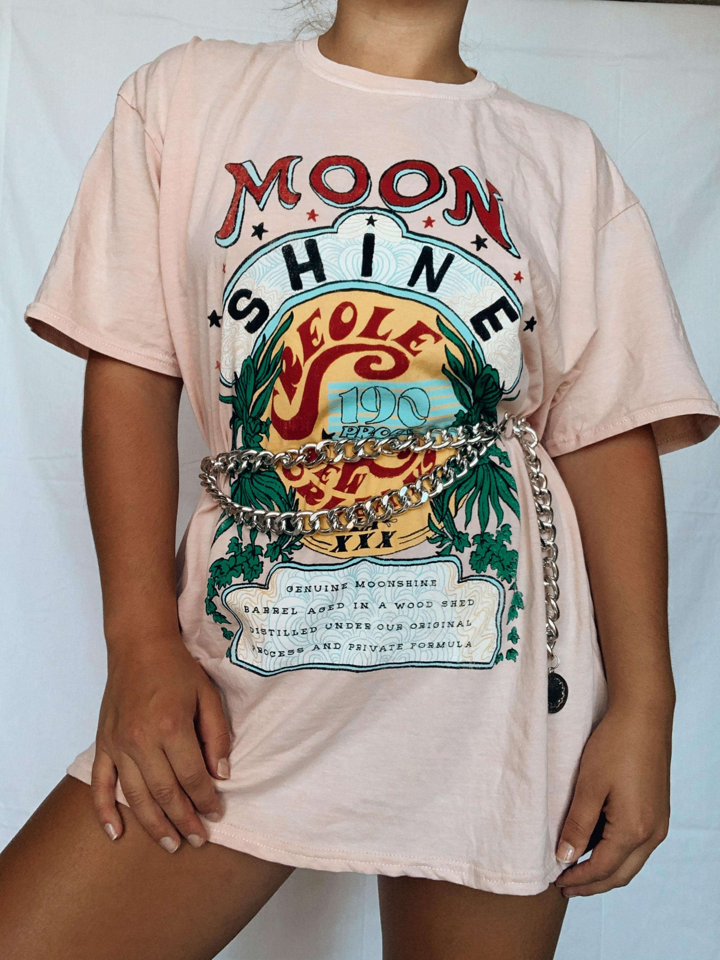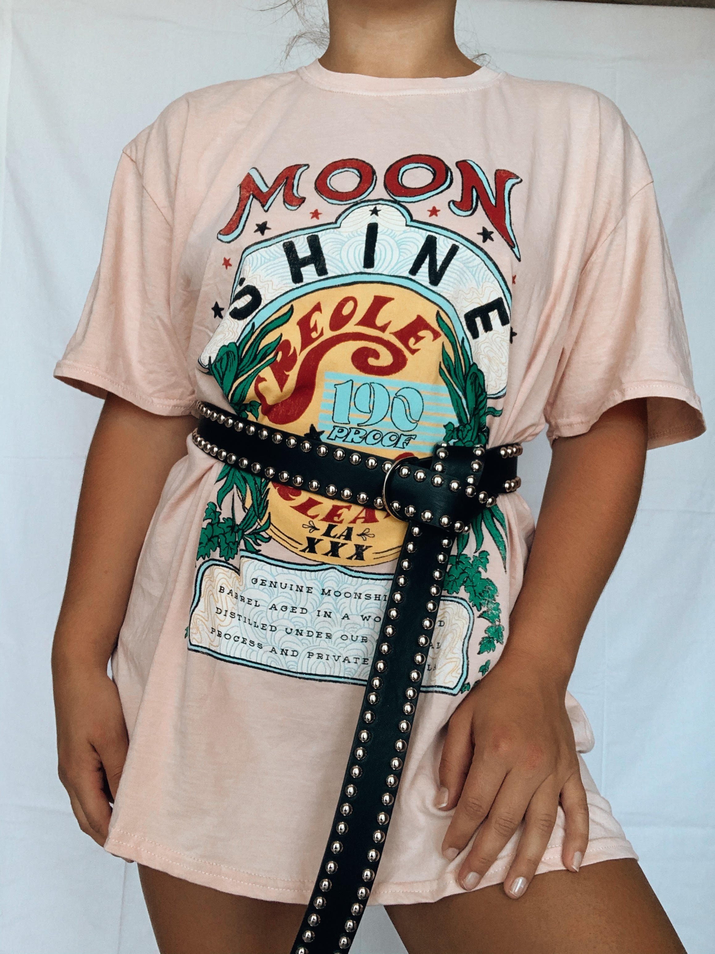 Belts are the perfect accessory for dressing up an oversized tee. In the photos I added Princess Polly statement belts- the Highway 61 Belt and the Artemis Belt in silver. I would dress these looks up with healed booties (Therapy Black Patent Allow Boots – ON SALE, Therapy Snake Alloy Boots – ON SALE or Wanna Croc ‘N’ Roll Faux Leather Healed Boots). An oversized tee with a statement belt and booties makes for the perfect edgy-chic look for a girls night out!