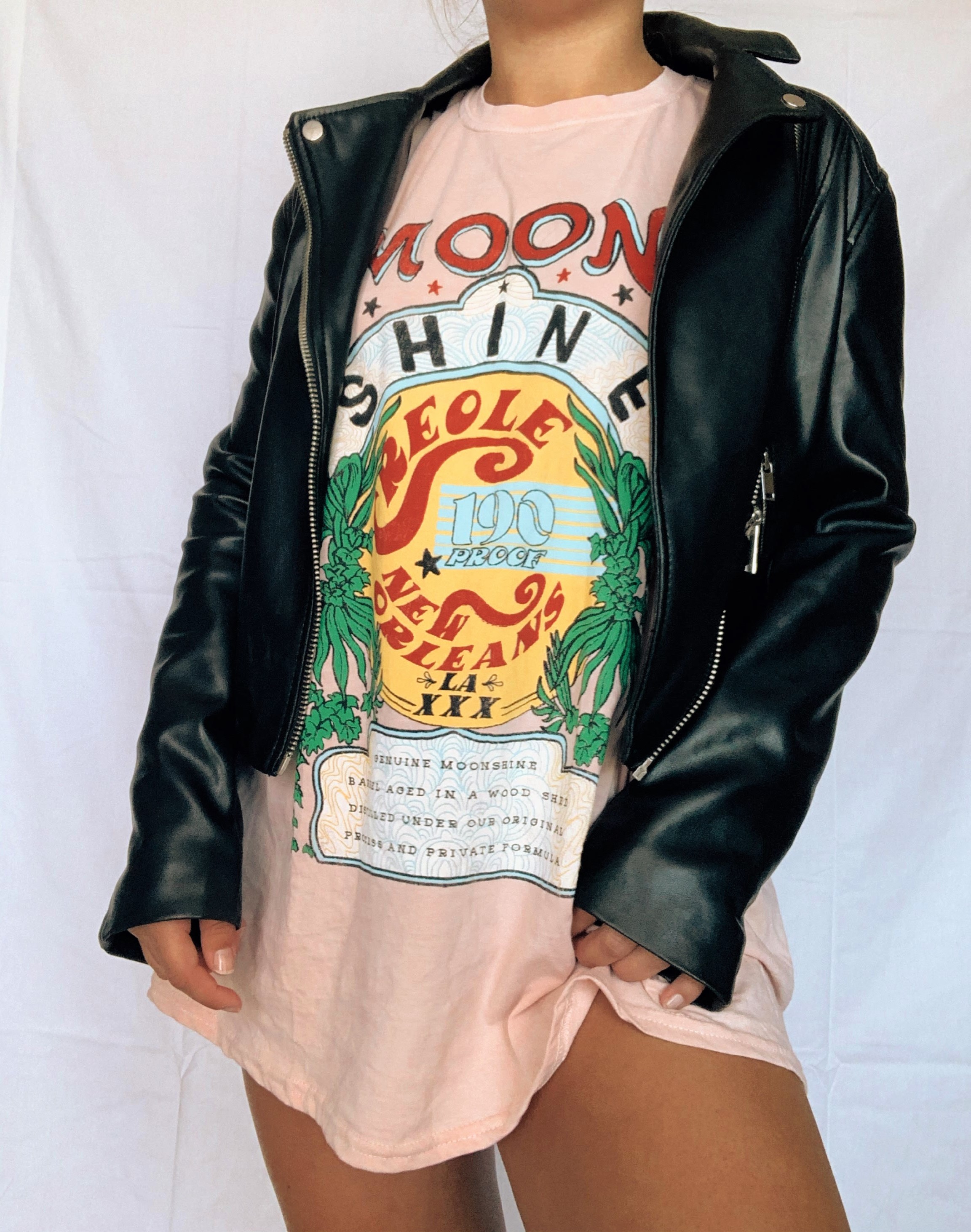 There is nothing better than an oversized jean jacket layered over an oversized tee. Adding a jacket is an easy way to either dress down (jean jacket) or dress up (leather jacket) your look. You can pair booties or sneakers to your look- it all depends on the jacket style you add on and what look you’re going for!
