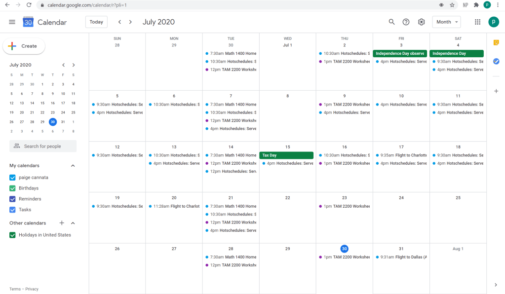 Using electronic reminders on top of paper planning is always a good idea! I use Reminders on my IPhone for high-point assignments/ projects, and Google Calendar for mandatory social/ work commitments. All that is doing is backing up your self-scheduling and keeping you on top of your obligations if you forget. Here is a screenshot of my google calendar for the month of July. As you can see, I have my work shifts, summer assignments and important social events (flights). Tip: using gmail automatically adds any scheduling to your google calendar!