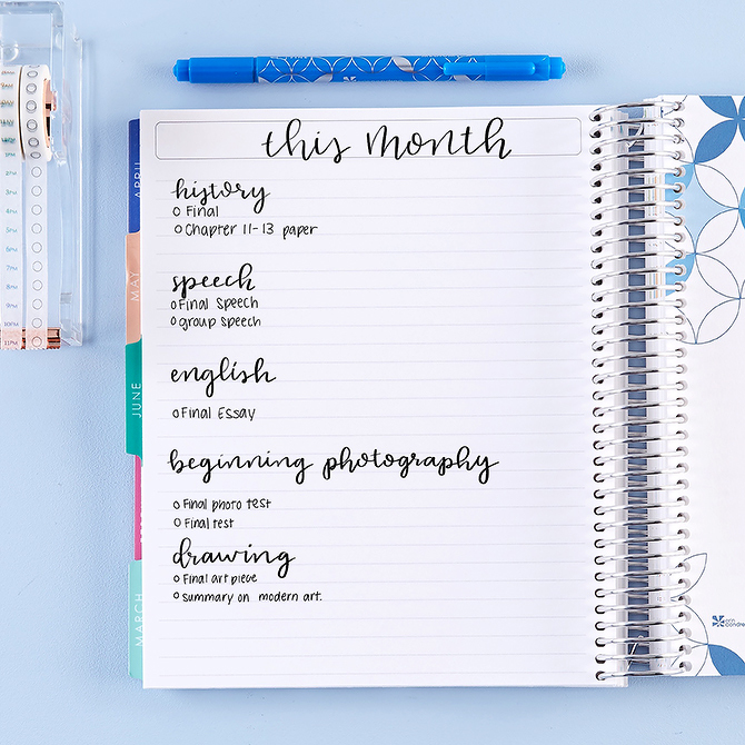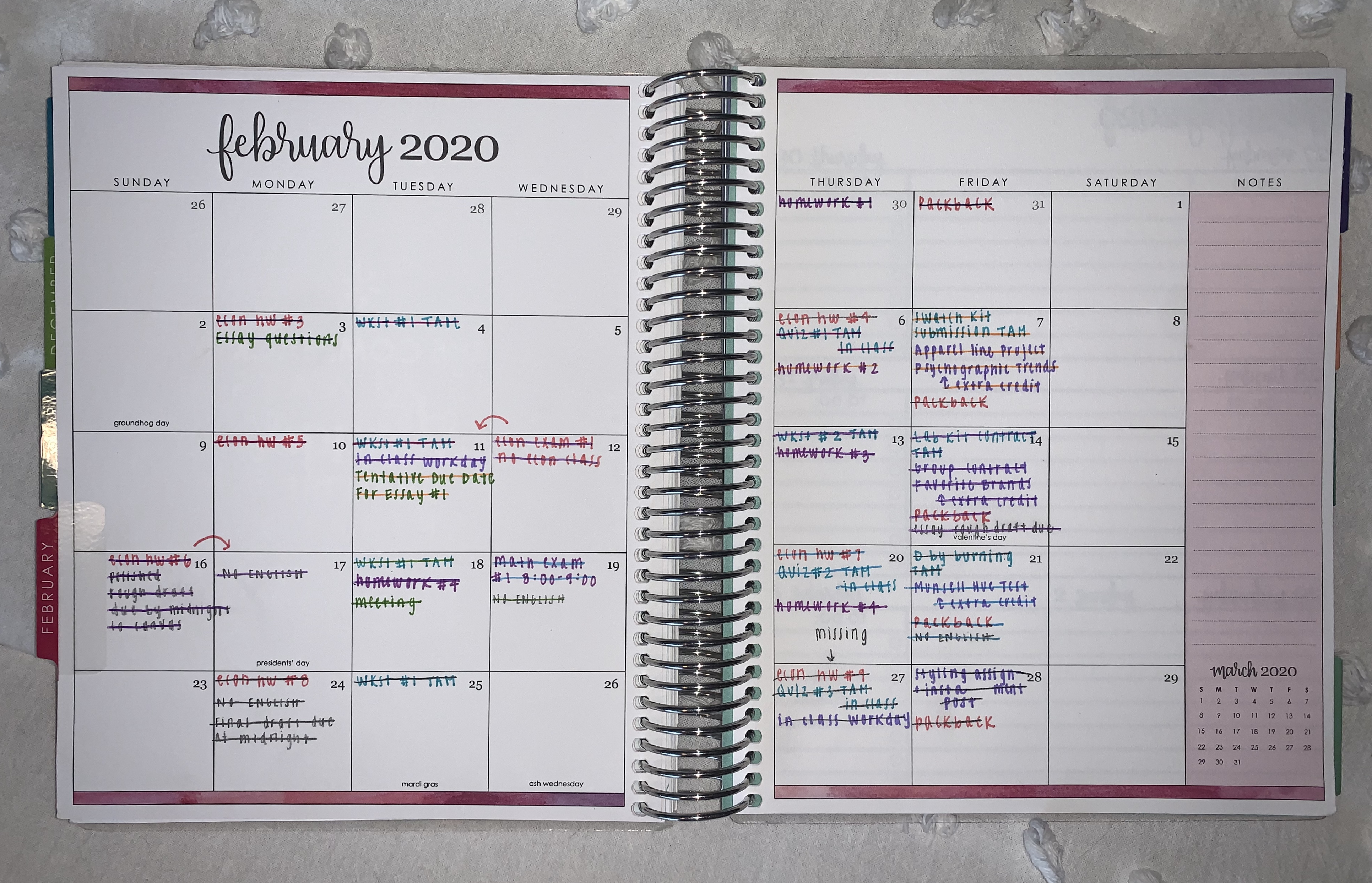 Here are some shots of my academic planner from this past February. One of my favorite tips is color coordinating your assignments by class. For example, in the pictures you can see that all of my Economics assignments are written in pink. Color Coordinating makes reading your monthly to-dos more efficient.